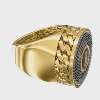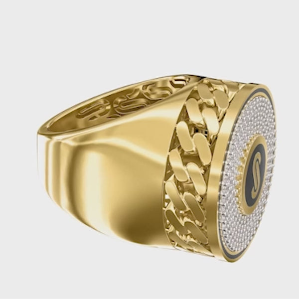 Rows of black or white cubic zirconia are set in an intricate 10 or 14K yellow gold band around the iconic Monaco Chain logo, creating the perfect luxury men's gold ring.